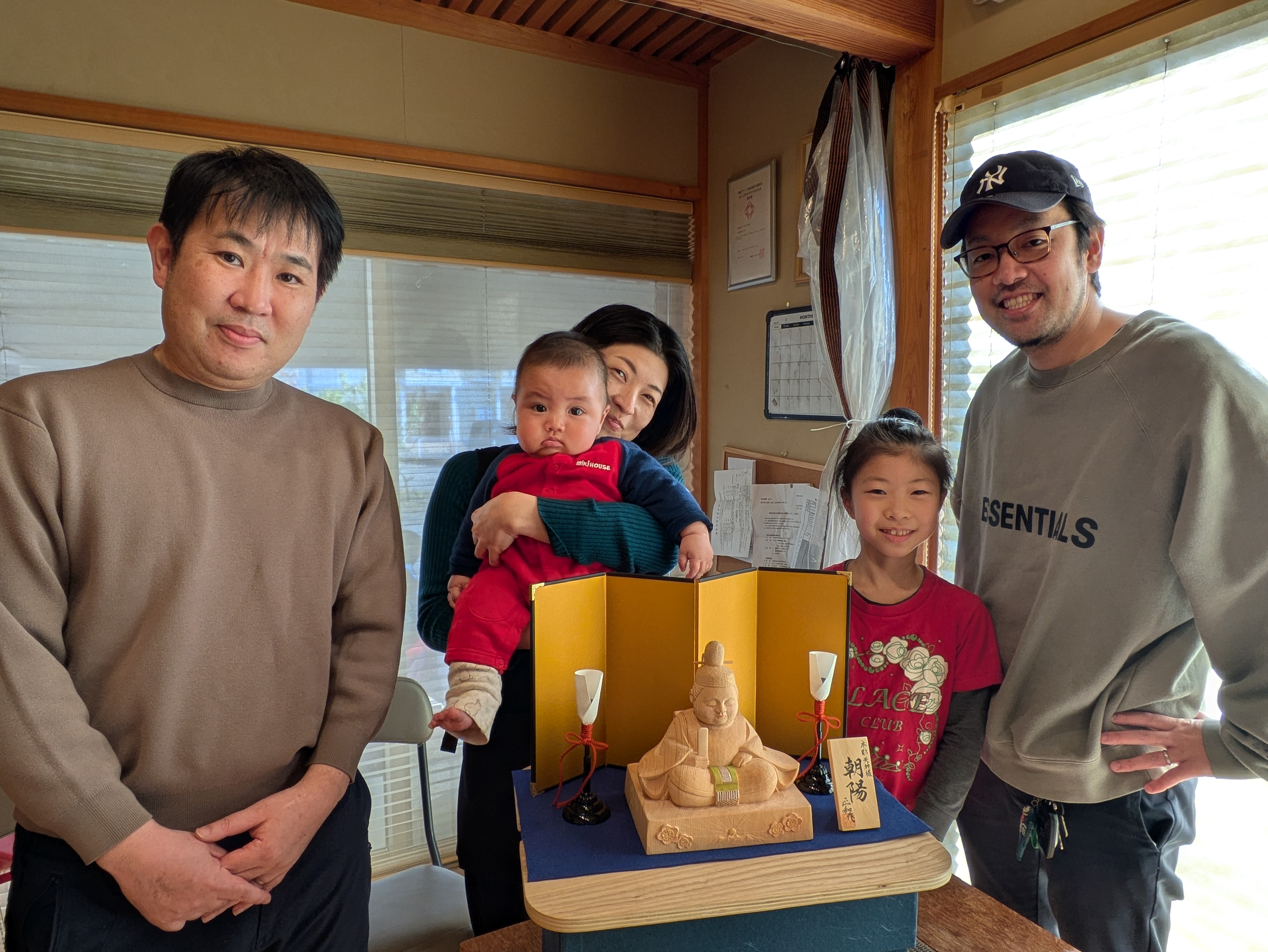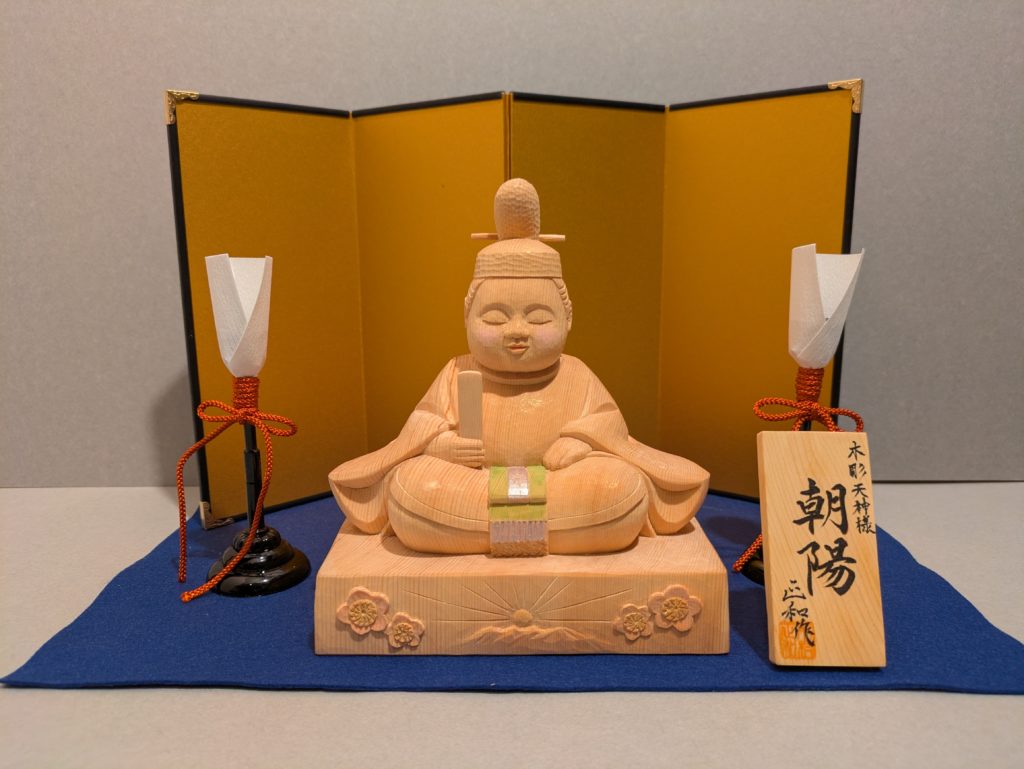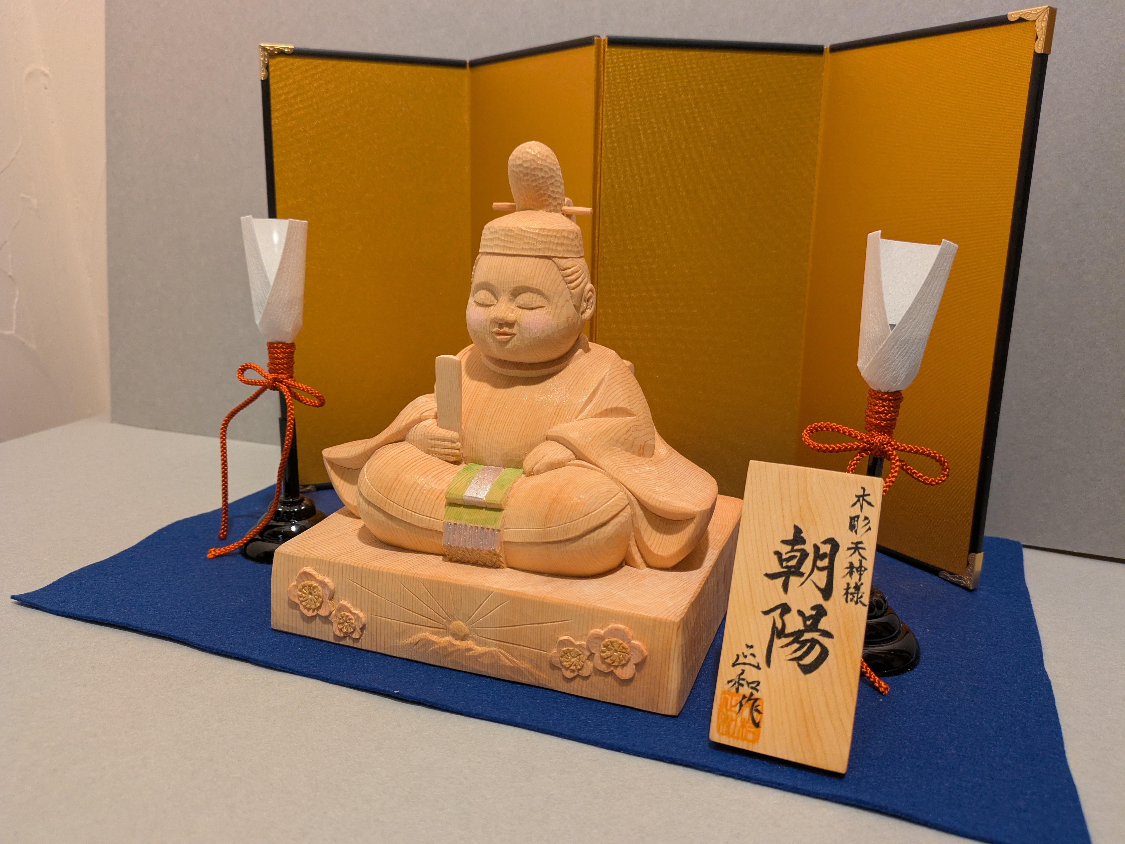 かわいらしい木彫の天神様 ブログ 2025.12.28 お客様からのご依頼でかわいらしい木彫の天神様を制作しました。富山県では長男が生まれると学問の神様菅原道真公(天神様)をお正月に床の間に飾る風習があります。お子様のお名前に因み台座の正面に立山連峰から昇る朝日のレリーフをご提案して入れました。お子様のお顔と天神様が似ていると喜んでいただけ嬉しく思います。 サイズ 前巾15cm 高さ18cm 奥行10cm 材料 木曽ヒノキ BlueskyCopy