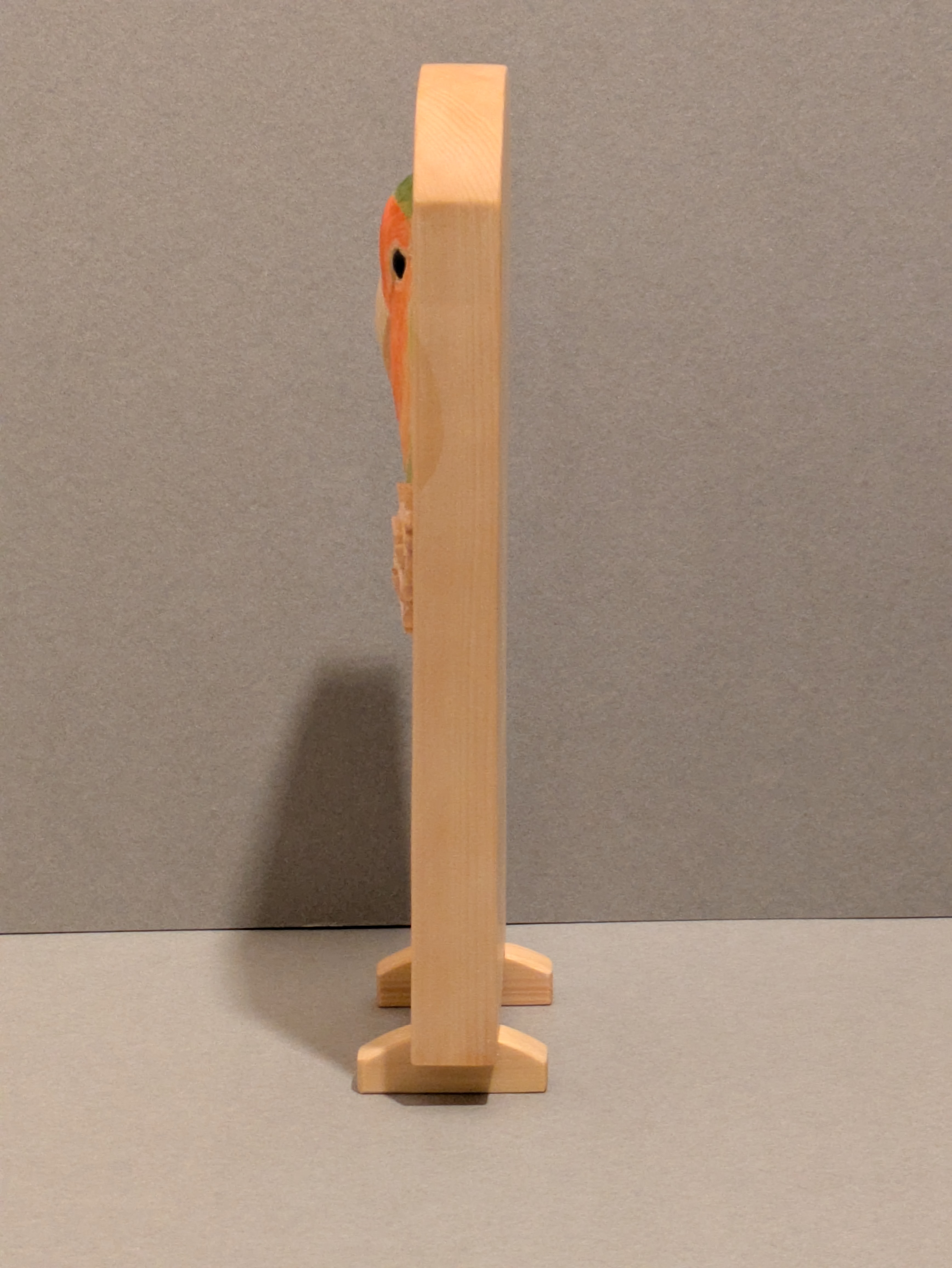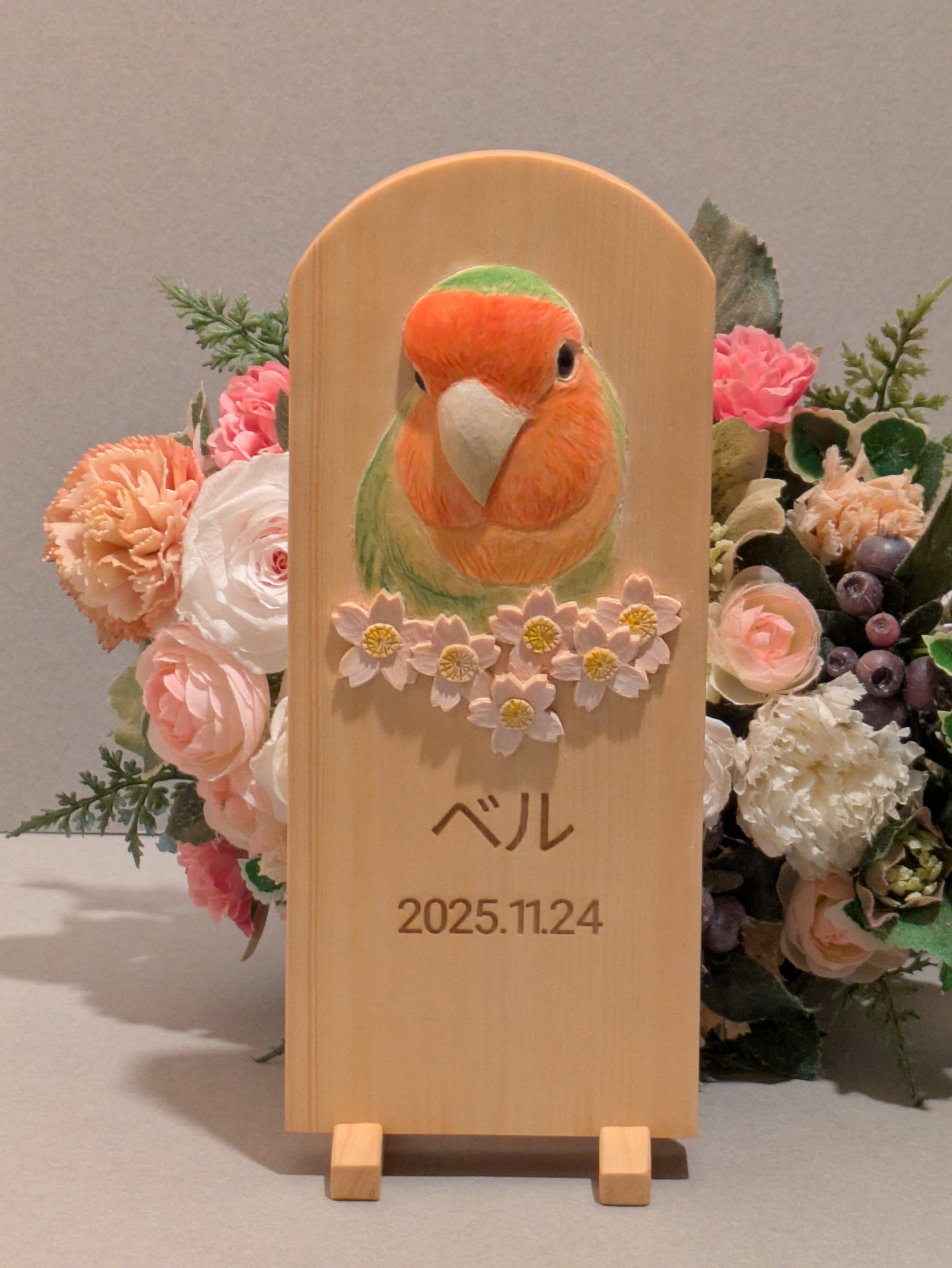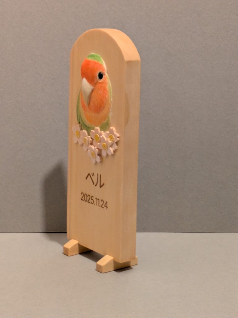 お客様からのご注文でコザクラインコのベルちゃんの木彫のご位牌を制作致しました。コザクラインコという事、ベルちゃんが春に生まれた事を考慮いたしましてベルちゃんの姿に桜のレリーフをあしらう事をご提案させていただきました。色鮮やかなベルちゃんの羽根の色もあって可愛らしいご位牌になりました。