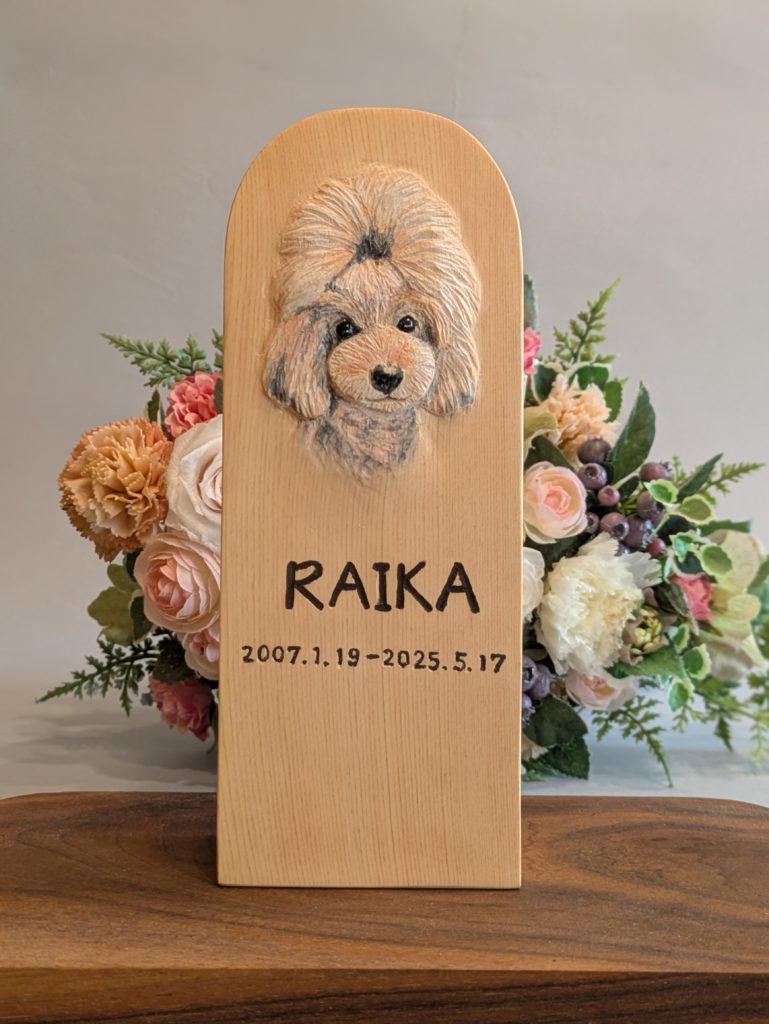 ペットのご位牌を制作しました。 ブログ 2025.08.08 お客様からのご注文で愛犬のレリーフ入りの木彫ご位牌を制作しました。材料はヒノキ材で愛犬の顔のレリーフと愛犬の名前、誕生日、没日を入れました。生前、愛犬のライカちゃんは頭の上で毛を束ねていたそうでその特徴も木彫で再現しました。 BlueskyCopy