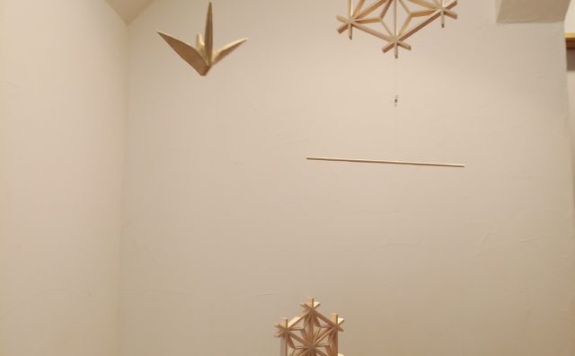 ブログ モビール 和のモビール 組子細工×井波彫刻砺波市の河島建具さんの組子細工と井波彫刻で何かできないかといく提案で、組子×木彫のモビールを試作でつくってみました。和のインテリアになるように折り鶴を木彫で制作し竹ひごと釣り糸をつかいモビールにしました。 2018.12.28 ブログ